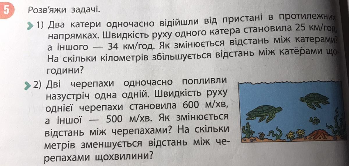 1) Два катера одновременно отошли от пристани в противоположных направлениях. Скорость движения одного катера составляла 25 км/ч, а другого 34 км/ч. Как меняется расстояние между катерами? На сколько километров увеличивается расстояние между катерами в час? 2) Две черепахи одновременно поплыли навстречу друг другу. Скорость движения одной черепахи составляла 600 м/мин, а другой 500 м/мин. Как меняется расстояние между черепахами? На сколько метров уменьшается расстояние между черепами ежеминутно