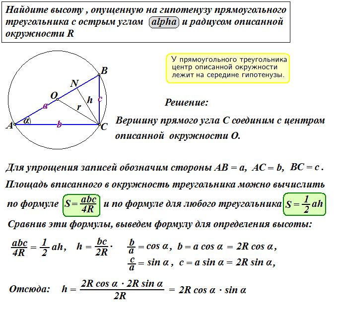 найдите высоту , опущенную на гипотенузу прямоугольного треугольника с острым углом