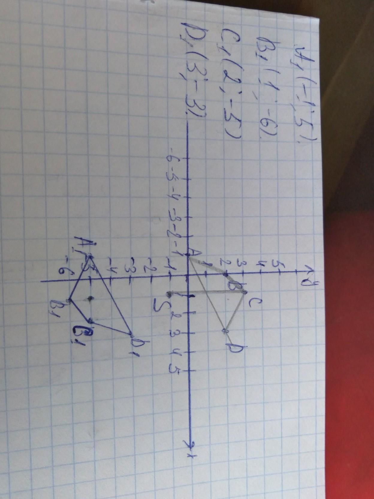 Построить фигуру F, симметричную АВСD относительно точки S.Определите координаты фигуры F: A(-1;0),B(0;2),C(1;3), D(3;2) S(1;-1)