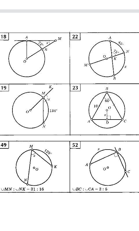 18)т.к дуга,на которую опирается ц. угол равна 72, то и ц. угол будет равен 72