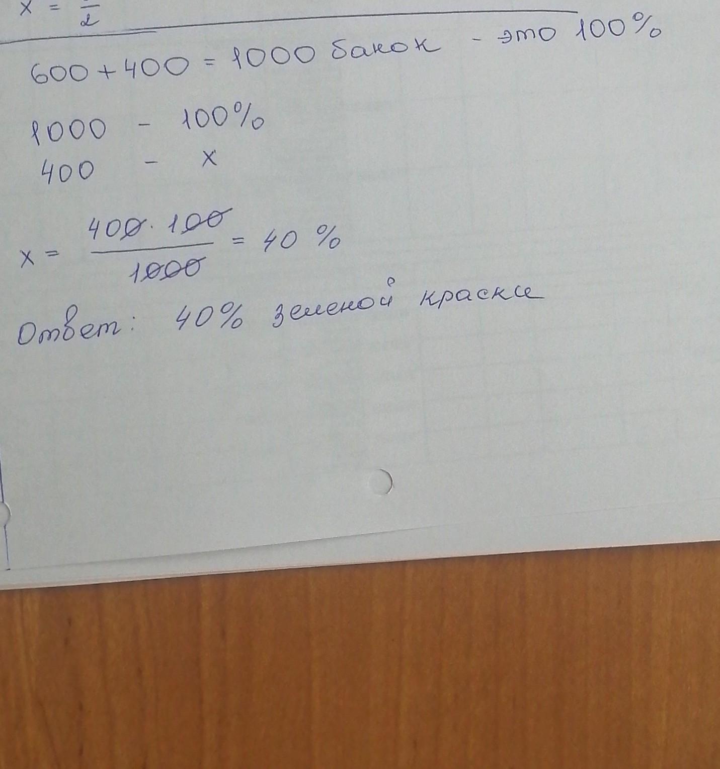 В строительном магазине было 600 банок красной краски и 400 банок зеленой краски. Сколько процентов от всей краски составляет зеленая краска.