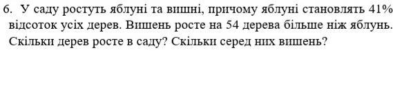 Яблонь 41%, значит вишень - 59%. => 59% - 41% = 18% всех деревьев составляют 54 штуки => всего деревьев 54 / 0.18 = 300. А вишень при этом 300 * 0.59 = 177