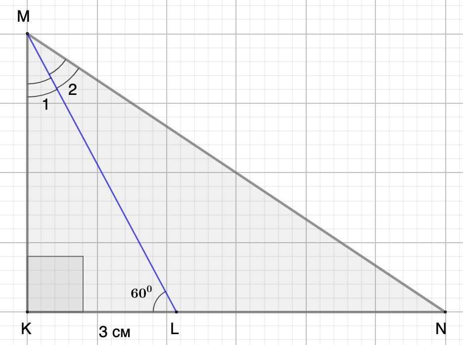 Выполни задания В прямоугольном треугольнике KMN(K — прямой) проведена биссектриса ML. Угол MLK равен 60 градусов, KL равен 3 см. Найди LN.