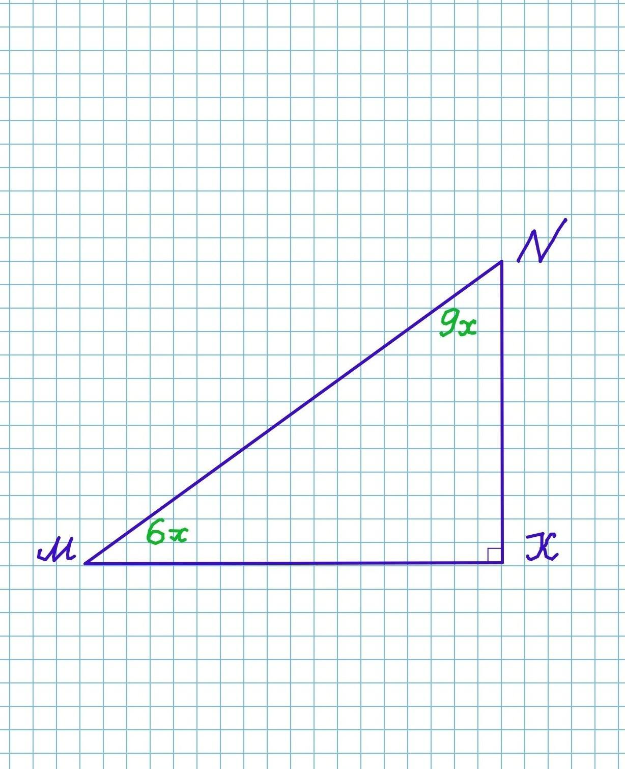 Дан прямоугольный треугольник KMN(∠К=90°). ∠М:∠N=6:9.