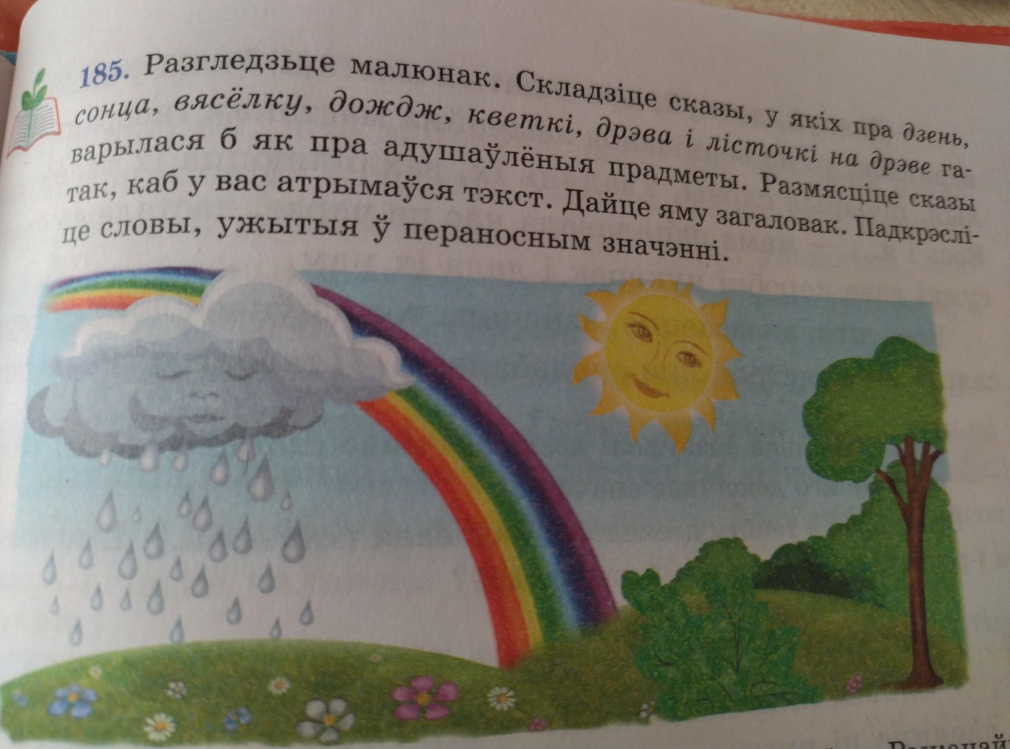 НАЗВАНІЕ: Дзень у лузе. Сёння быў прыгожы дзень. Сонейка глядзела на усю Зямлю і ласкала яе праменчыкамі. Дрыўцы і кветачкі раскрыліся, пацягнуліся з сваімі лісточкамі да прамянёў. Але адразу выбегла хмарка і паліўся дожджык. Што гэта за дуга хаваецца за кроплямі? Гэта жа вясёлка прывітаецца з і даруе сваю разнакаляровасць.