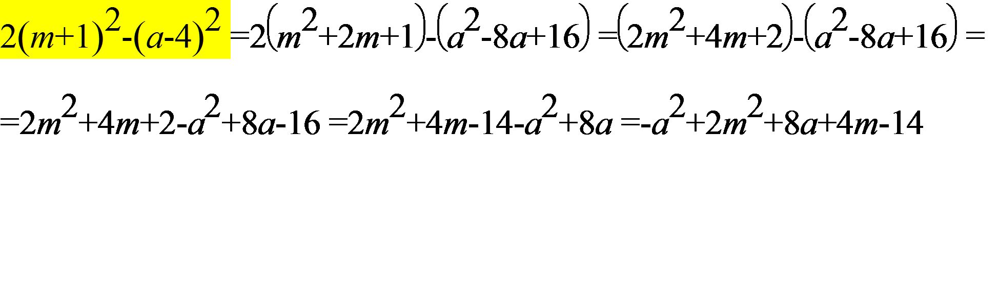 2(m+1)^2-(a-4)^2=2(m^2+2m+1)-(a^2-8a+16)=2m^2+4m+2-a^2+8a-16=2m^2+4m-a^2+8a-14