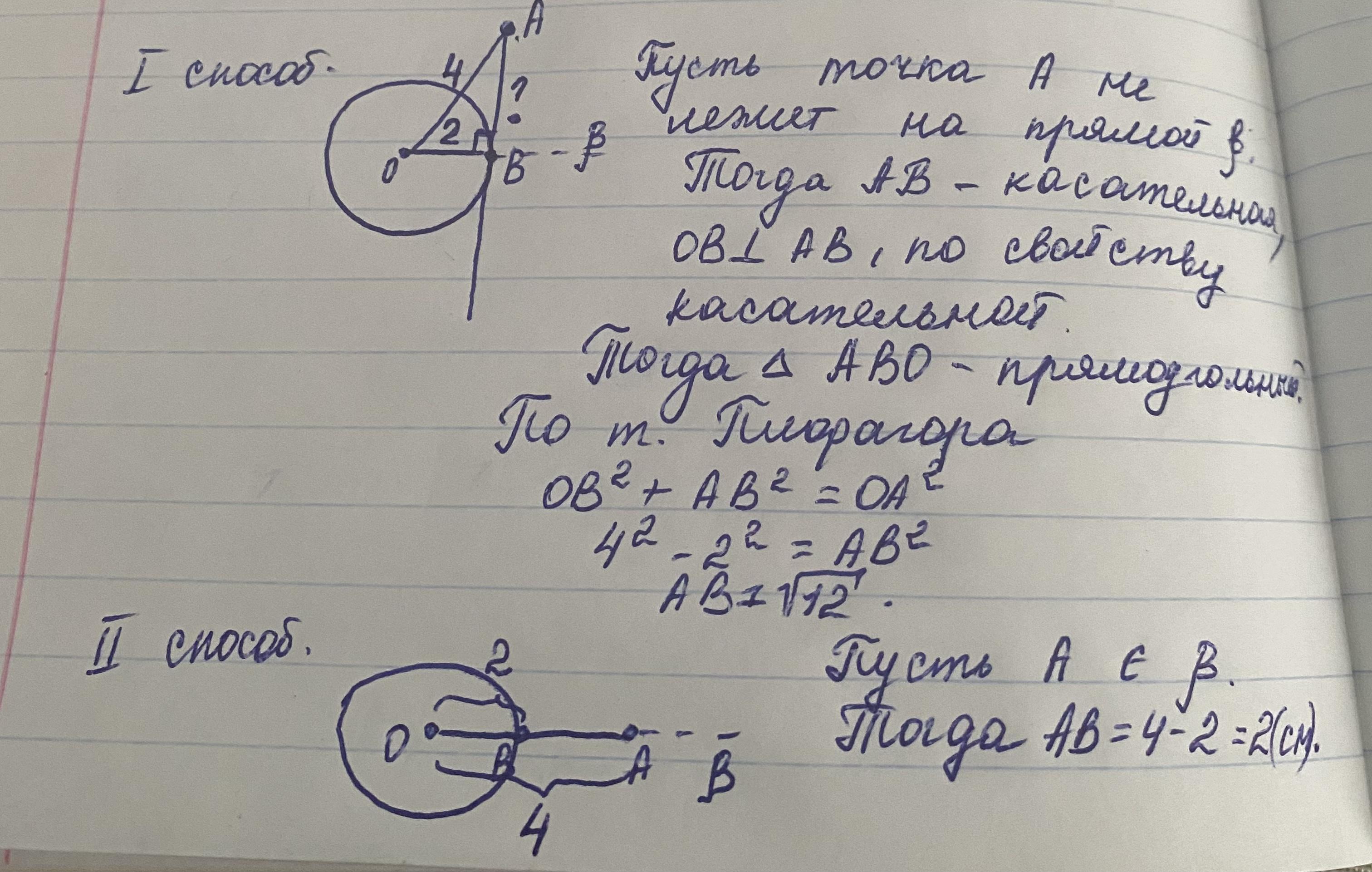 А до центра О равно 4 см. Найдите длину отрезка AB, касательного к окружности, где В — точка касания.