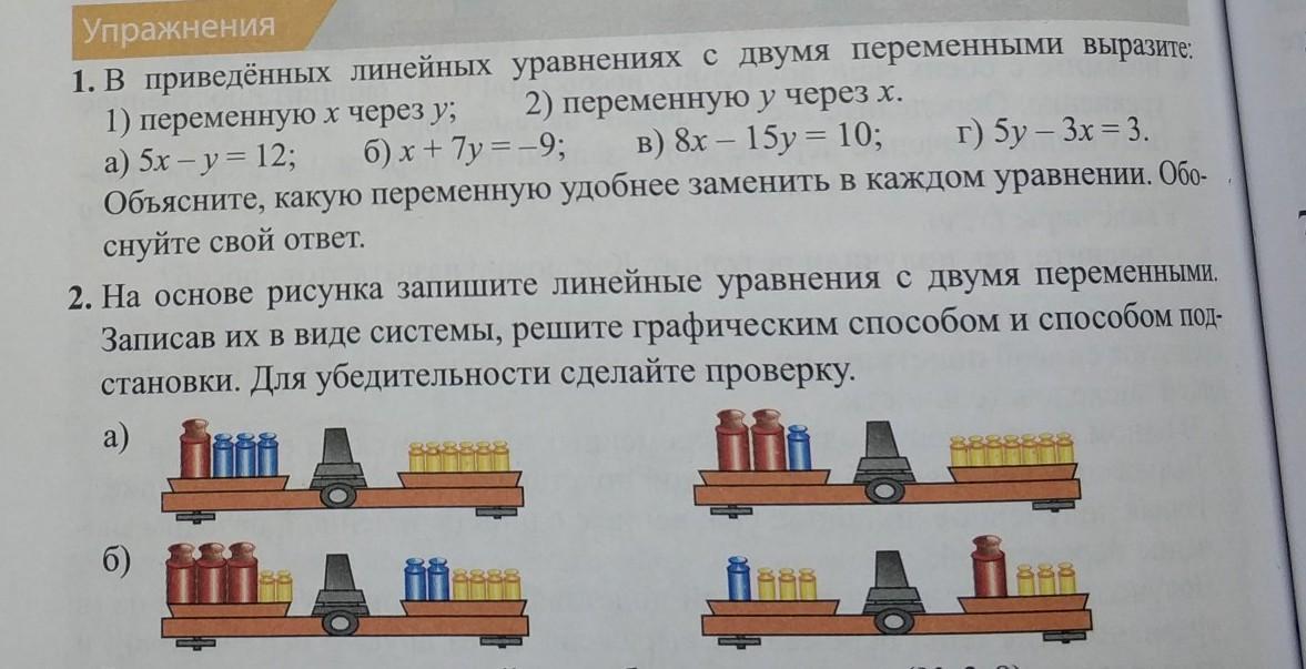 1) 5х-у=12 . б) х+7у=-9. в) 8х-15у=10. х=-9-7у