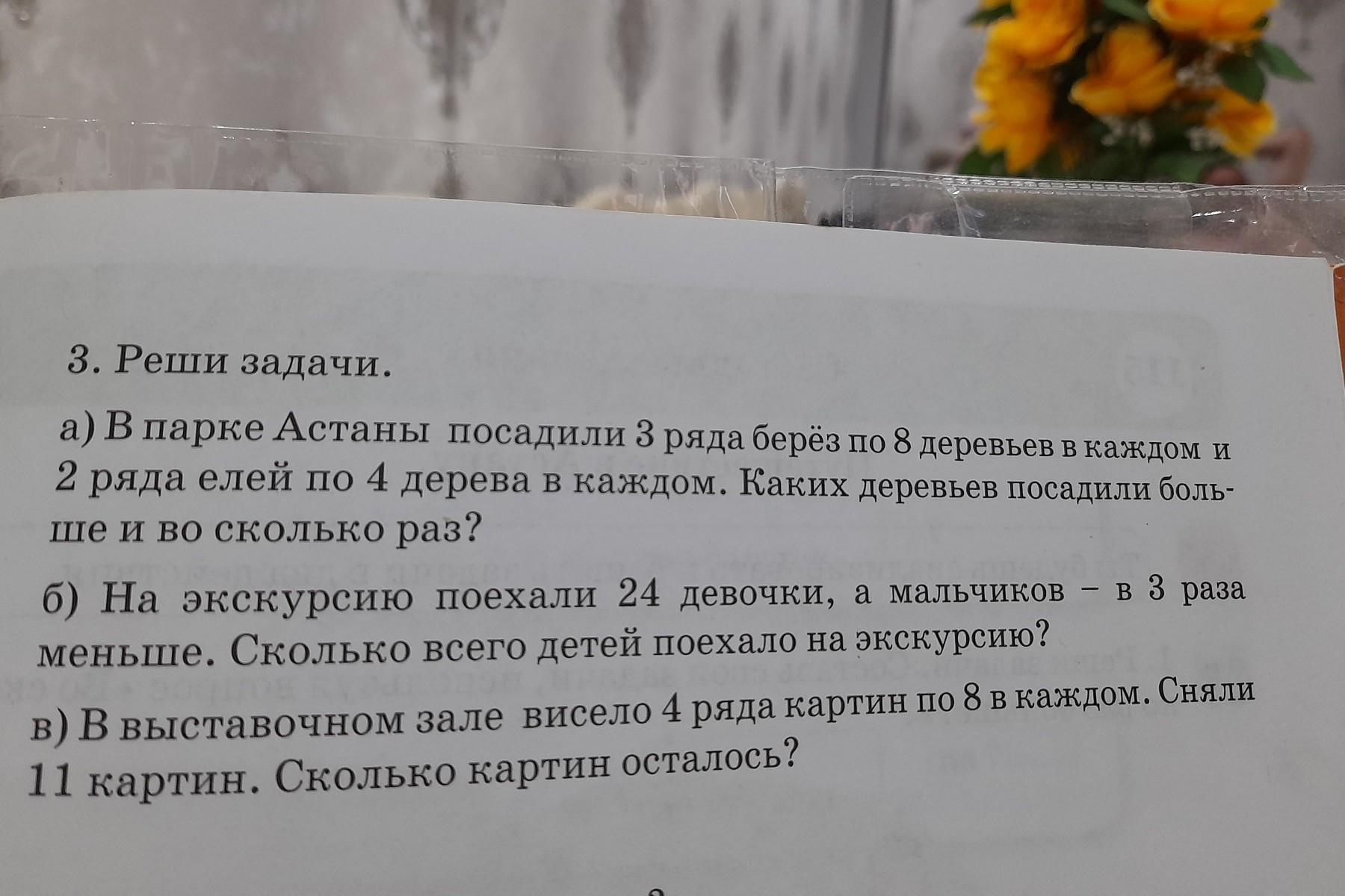 3. Реши задачи. а) В парке Астаны посадили 3 ряда берёз по 8 деревьев в каждом и 2 ряда елей по 4 дерева в каждом. Каких деревьев посадили боль- 2 ше и во сколько раз? можете полностю задачу написать все 3