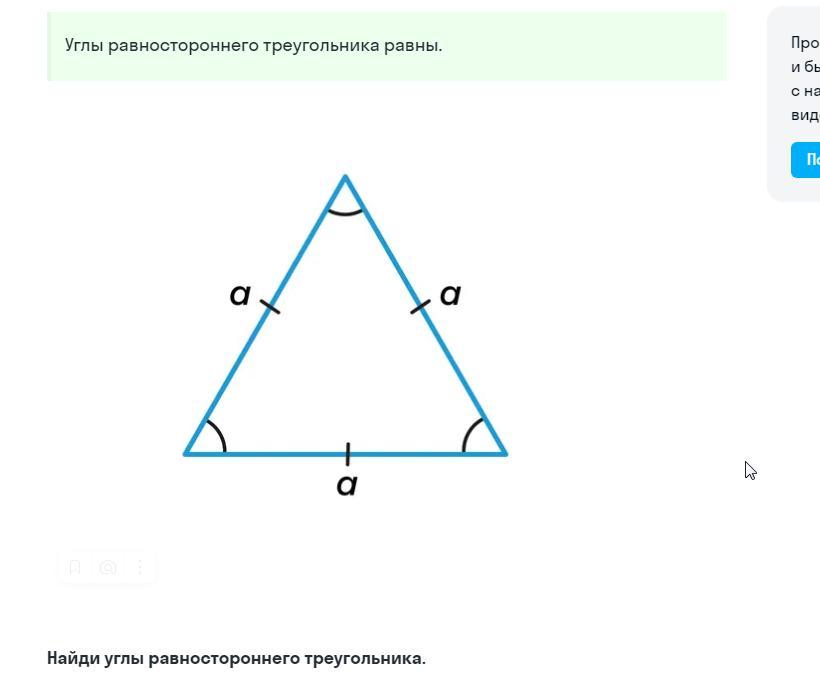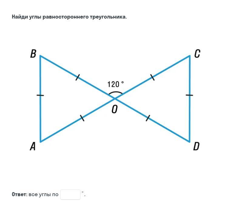 1) Сумма углов в треугольнике равна 180° , так как треугольник равносторонний, то все его углы равны, значит каждый из них равен по 60°