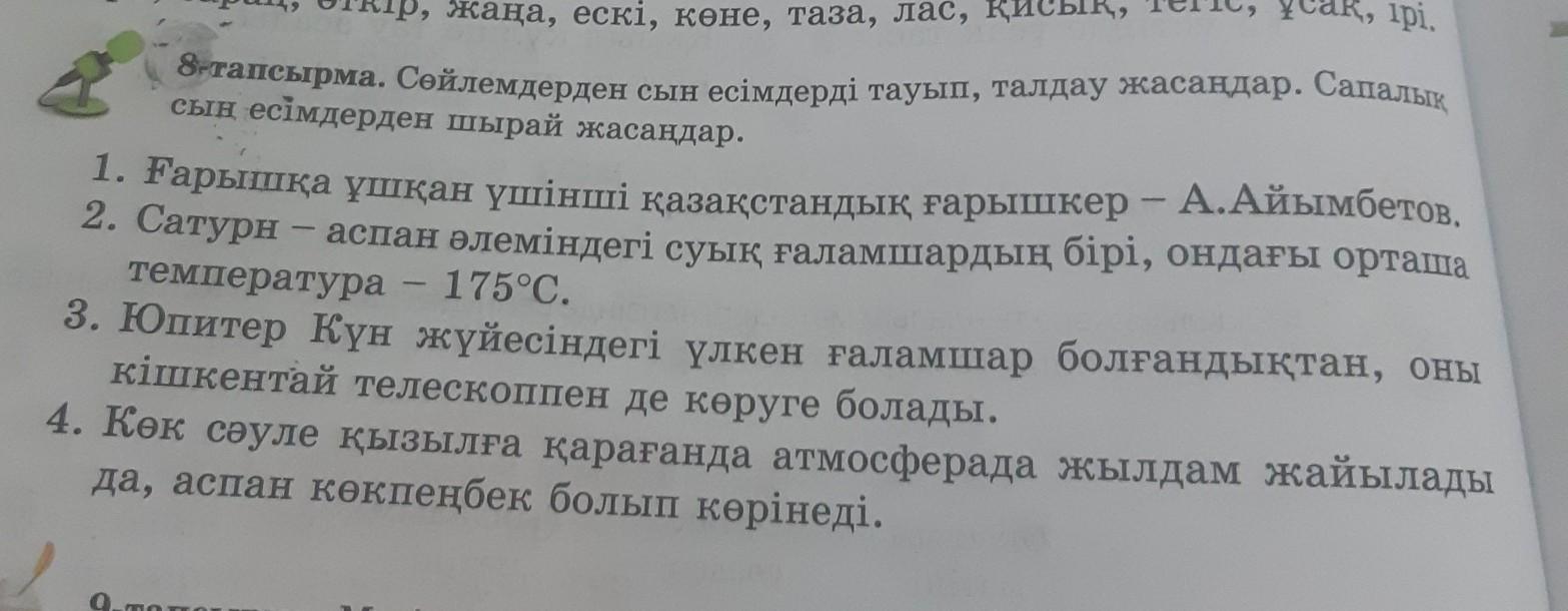 8 тапсырма. Сөйлемдерден сын есімдерді тауып, талдау жасаңдар. Сапалық сын есімдерден шырай жасаңдар. 1. Ғарышқа ұшқан үшінші қазақстандық ғарышкер – А.Айымбетов. 2. Сатурн — аспан әлеміндегі суық ғаламшардың бірі, ондағы орташа температура 175°С. 3. Юпитер Күн жүйесіндегі үлкен ғаламшар болғандықтан, оны кішкентай телескоппен де көруге болады. 4. Көк сәуле қызылға қарағанда атмосферада жылдам жайылады да, аспан көкпеңбек болып көрінеді.