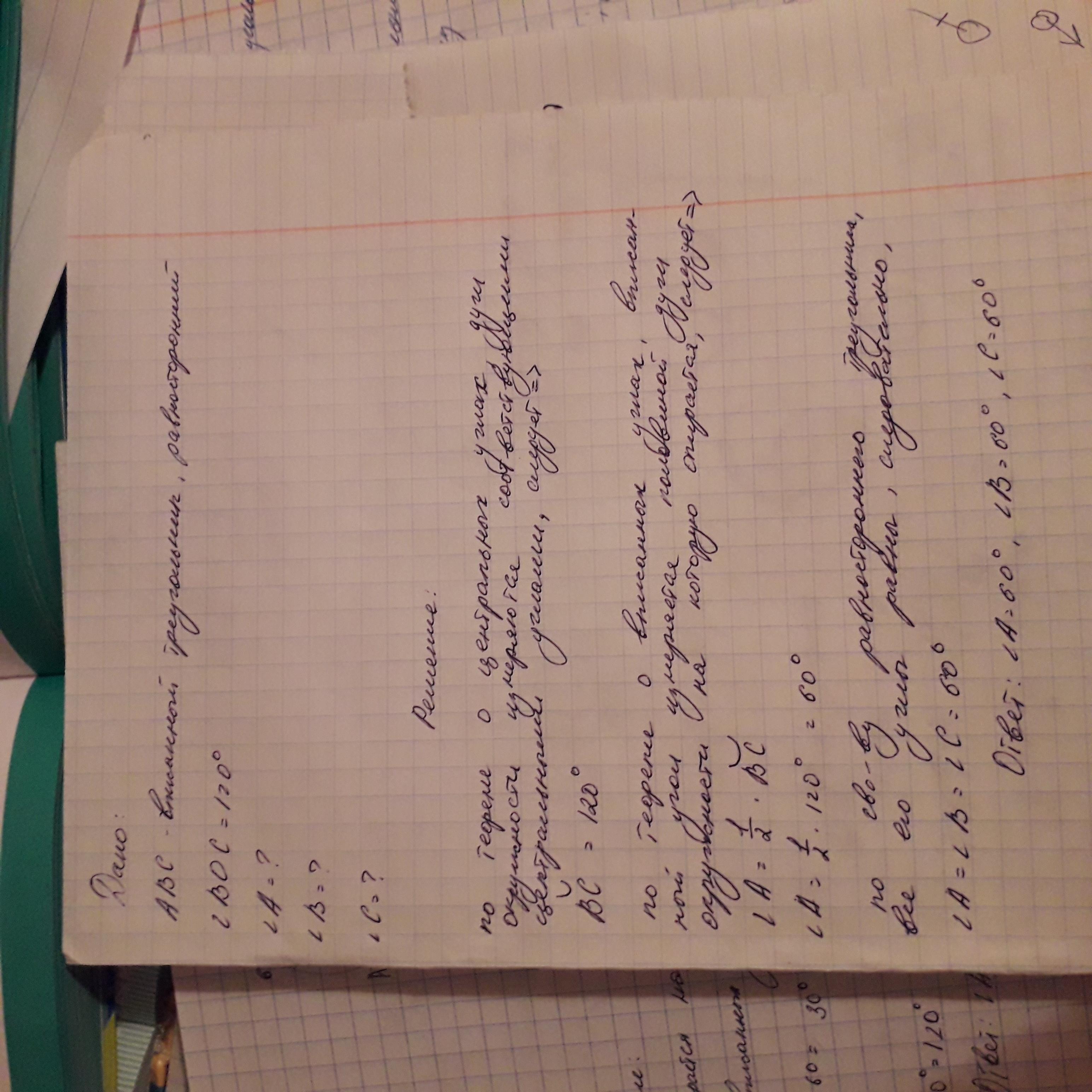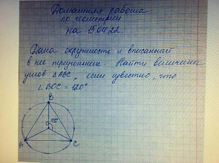 Дана окружность с центром в виде точки О и вписанный в неё треугольник. Найти величины углов треугольника АВС, если угол ВОС=120 градусам