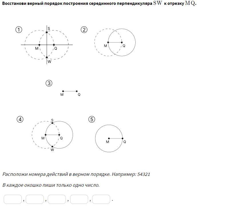 Восстанови верный порядок построения серединного перпендикуляра SW к отрезку MQ