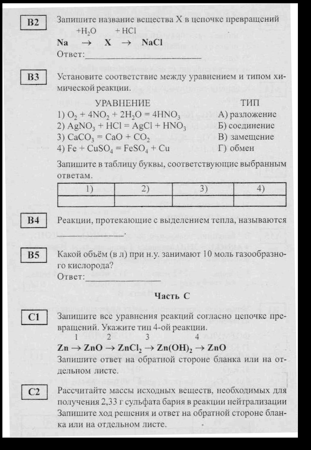 Б2 Ответ : NaOH Б3: 1)Б, 2)Г, 3)А, 4) В. Б4 - Экзотермические, Б5 - 10моль×22.4л/моль = 224 литра. С1 - 1) 2Zn+O2 ⇒ 2ZnO, 2) ZnO+2HCl⇒ZnCl2+H2O, 3) ZnCl2+2NaOH⇒Zn(OH)2+2NaCl, 4)Zn(OH)2⇒(при нагревании) ZnO+H2O. C2) H2SO4+Ba(OH)2=BaSO4+2H2O;