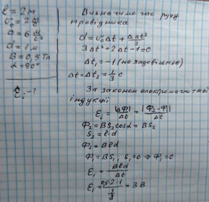 Прямий провідник довжиною ℓ = 2 м, рухаючись рівноприскорено в однорідному магнітному полі з початковою швидкістю v0 = 2 м/с і прискоренням a = 6 м/с2, перемістився на відстань d = 1 м. Магнітна індукція поля В = 0,5 Тл і напрямлена перпендикулярно до швидкості руху провідника. Визначити середню ЕРС індукції в провіднику і миттєве значення ЕРС індукції в провіднику в кінці переміщення.