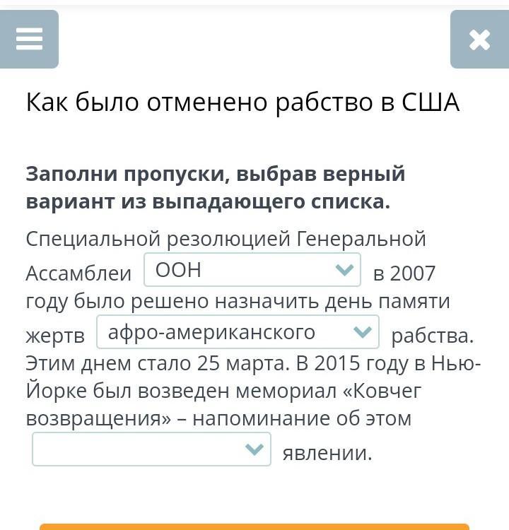 Как было отменено рабство в США Заполни пропуски, выбрав верный вариант из выпадающего списка. Специальной резолюцией Генеральной Ассамблеи ООН В 2007 году было решено назначить день памяти жертв афро-американского рабства. Этим днем стало 25 марта. В 2015 году в Нью- Йорке был возведен мемориал «Ковчег возвращения» — напоминание об этом Явлении. Помогите с третим ответом
