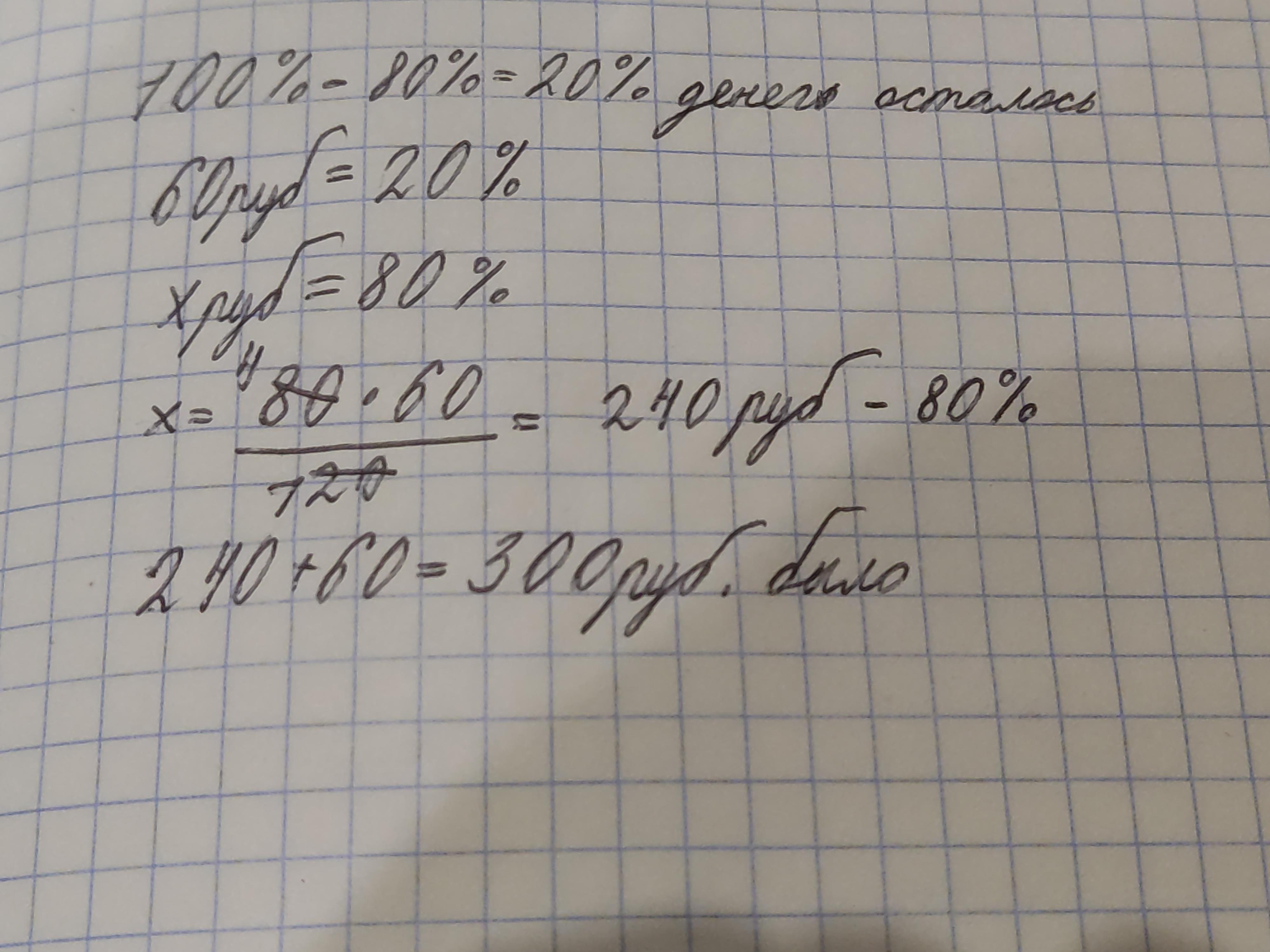 Потратили 80% имевшихся денег, и осталось 60 р. Сколько денег было