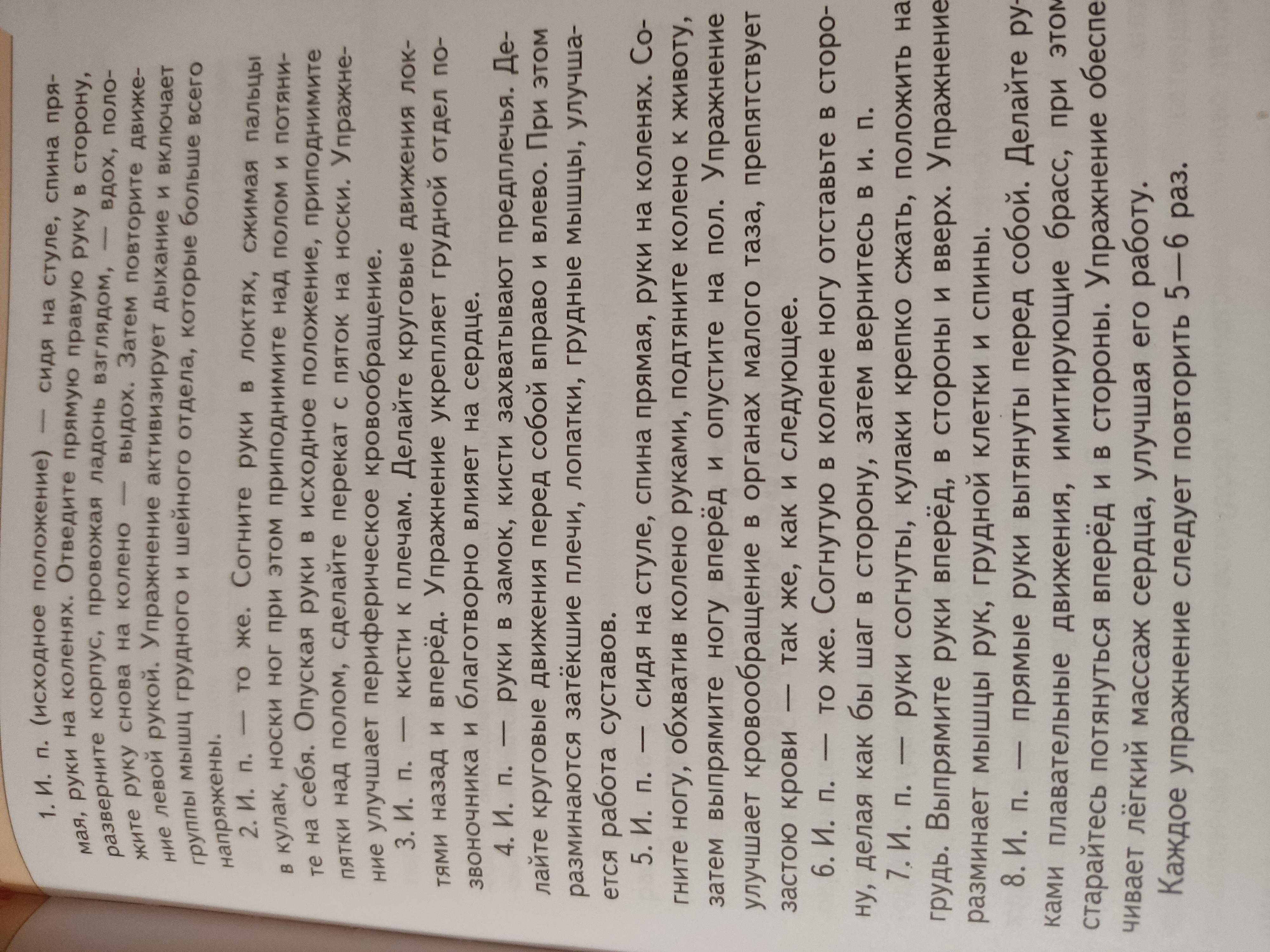 1. И. п. (исходное положение) - сидя на стуле, спина пря мая, руки на коленях. Отпустите правую руку в сторону, разверните корпус, провожалонь взглядом, жите руку снова на колено вдох, поло-выдох. Повторите движение левой руки. Упражнение активизирует дыхание и включает группы мышц грудного и шейного отдела, которые больше всего напряжены.