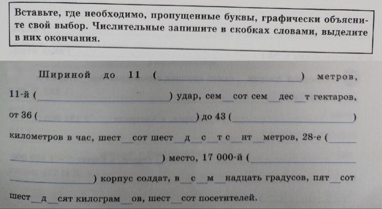 Шириной до одиннадцатИ метров, одиннадцатЫЙ удар,семьсот десять гектаров, от тридцатИ шестИ до сорокА трёх километров в час, шестьсот шестьдесят сантиметров, двадцать восьмОЕ место, семнадцать тысячнЫЙ корпус солдат, восемнадцать градусов, пятьсот шестьдесят килограммов, шестьсот посетителей.