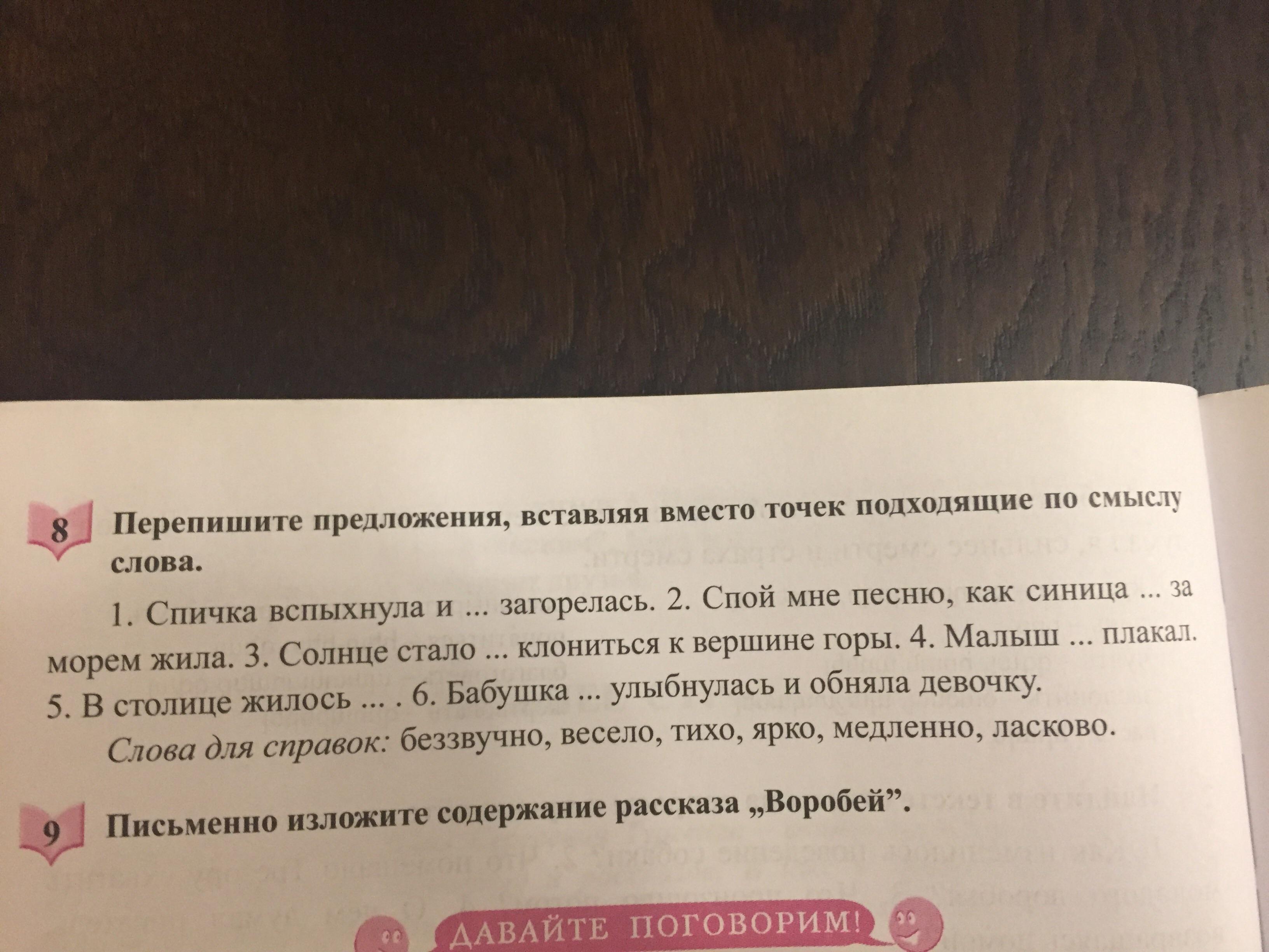 2. Спичка вспыхнула и медленно загорелась. Спой мне песню,как синица тихо за морем жила. Солнце стало ярко клониться к вершине горы. Малыш беззвучно плакал. В столице жилось весело. Бабушка ласково улыбнулась и обняла девочку.