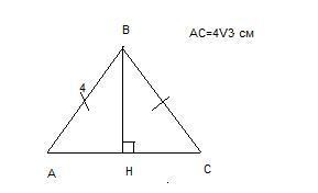 Основание равнобедренного треугольника равна 4√3 см, а боковая сторона 4 см. Найти углы треугольника. С рисунком