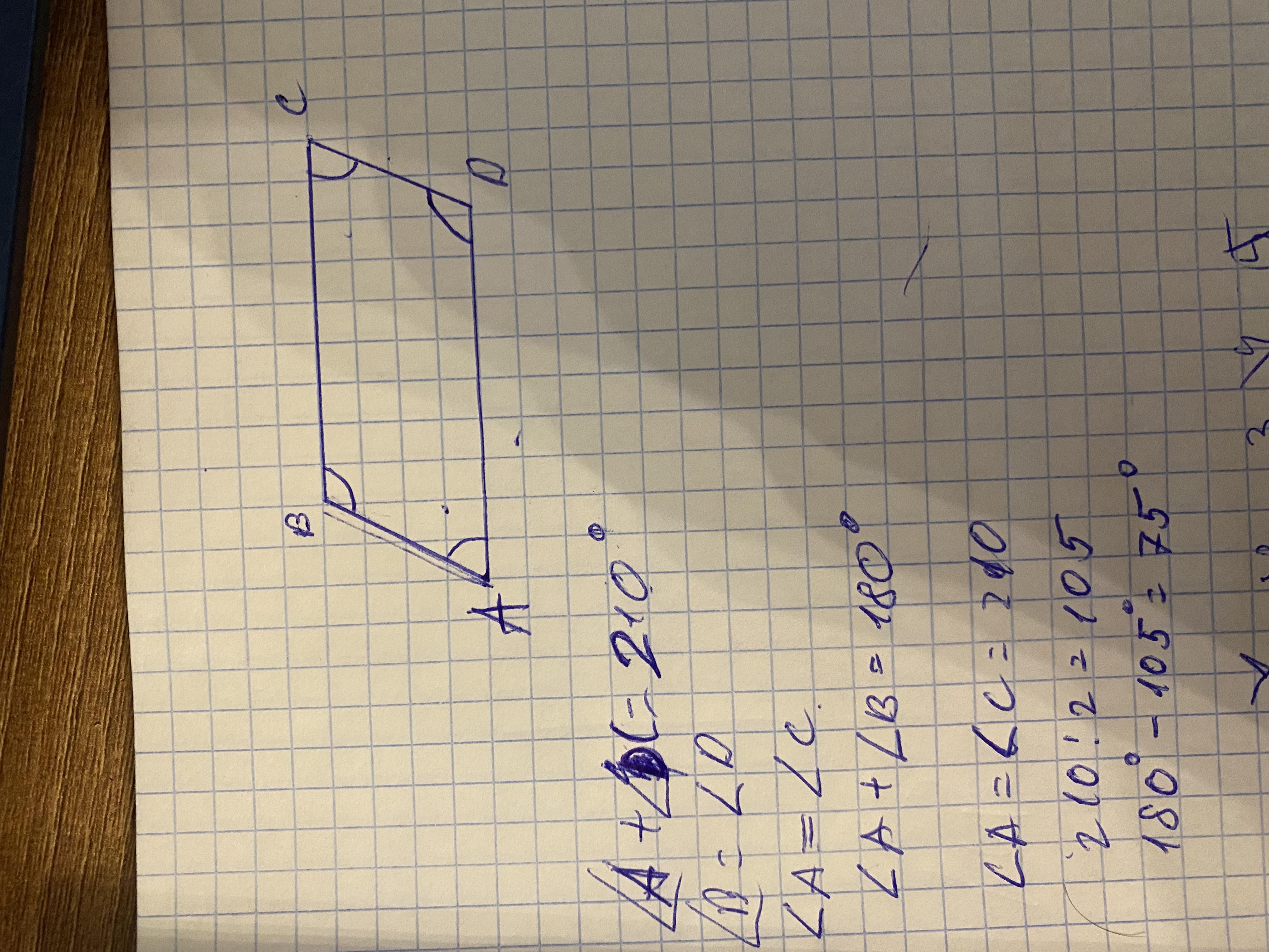 В параллелограмме сумма двух углов равна 210°. Найдите острый угол параллелограмма.ответ дайте в градусах