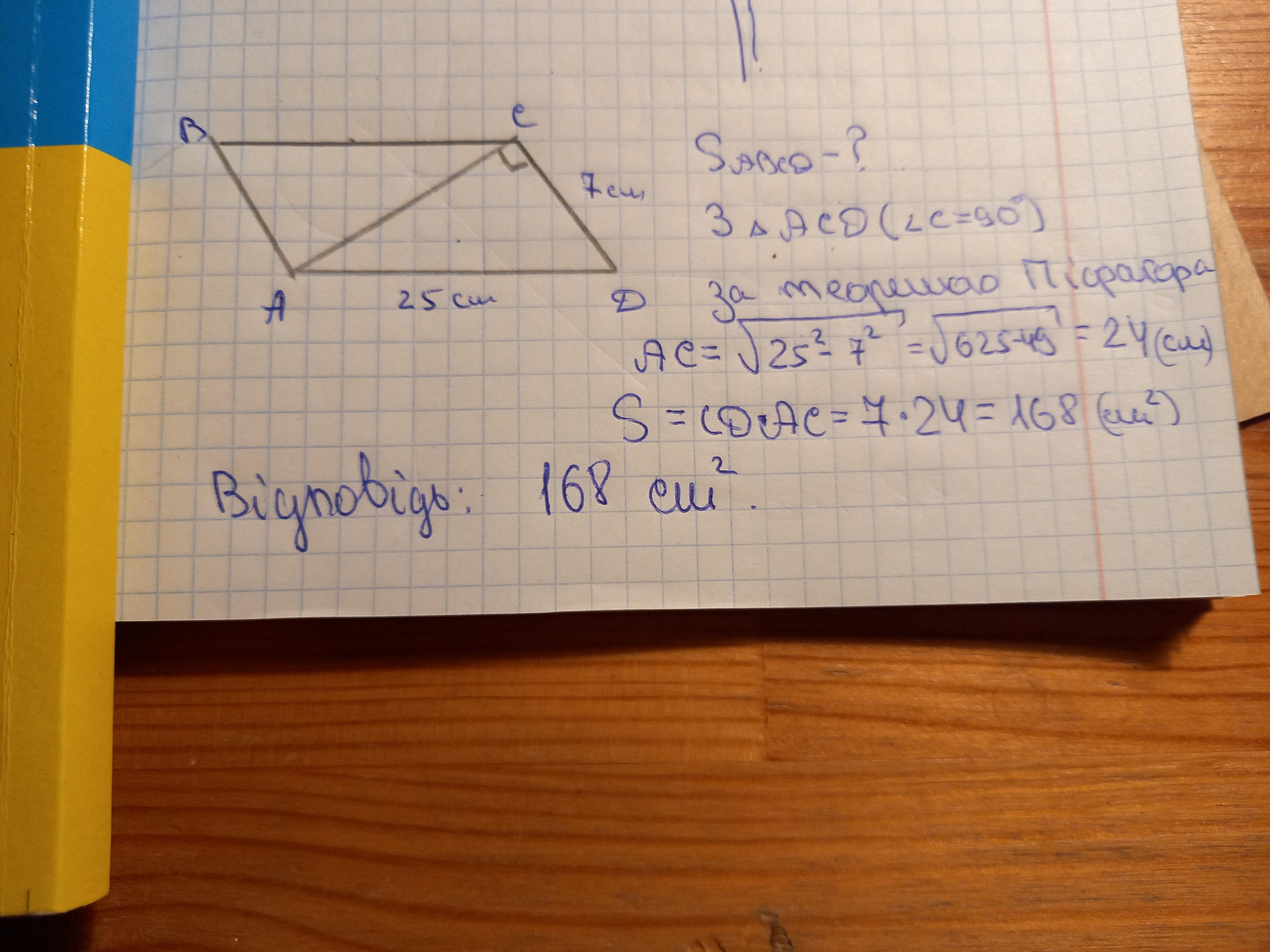 Сторони паралелограма дорівнюють 7 см і 25 см. Діагональ проведена під прямим кутом до сторони 7. Знайти площу паралелограма.