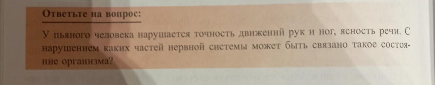 Ответьте на вопрос: У пьяного человека нарушается точность движений рук и ног, ясность речи. С нарушением каких частей нервной системы может быть связано такое состояние организма?ПЖ РЕБЯТ ПОМОГИТЕ ПОЖАЛУЙСТА (◠‿◕)