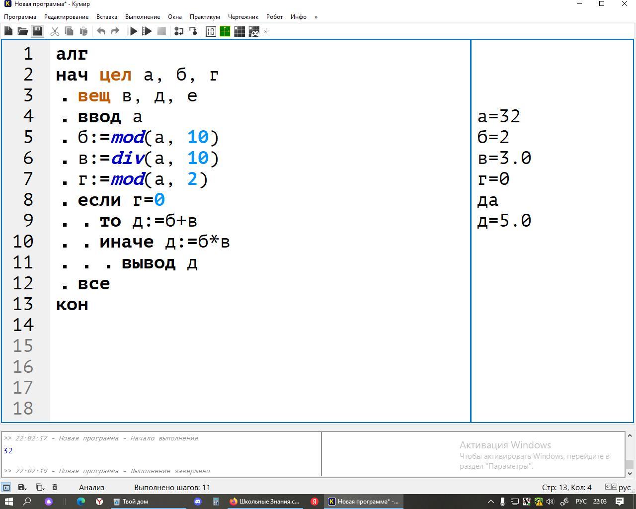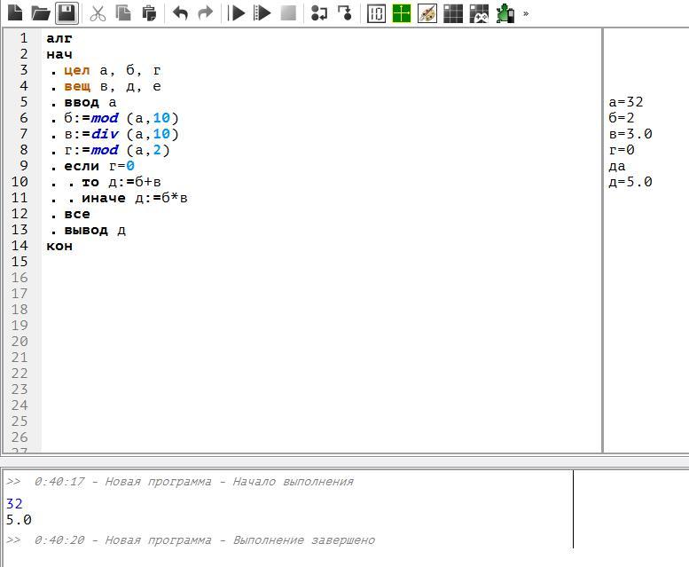 Задача звучит так: Найти сумму цифр введенного двузначного числа, если оно четное и их произведение, если число нечетное. И так, программа написана, в правом окне всё высчитано верно, но в нижнем всё равно написано 32. Как это исправить?