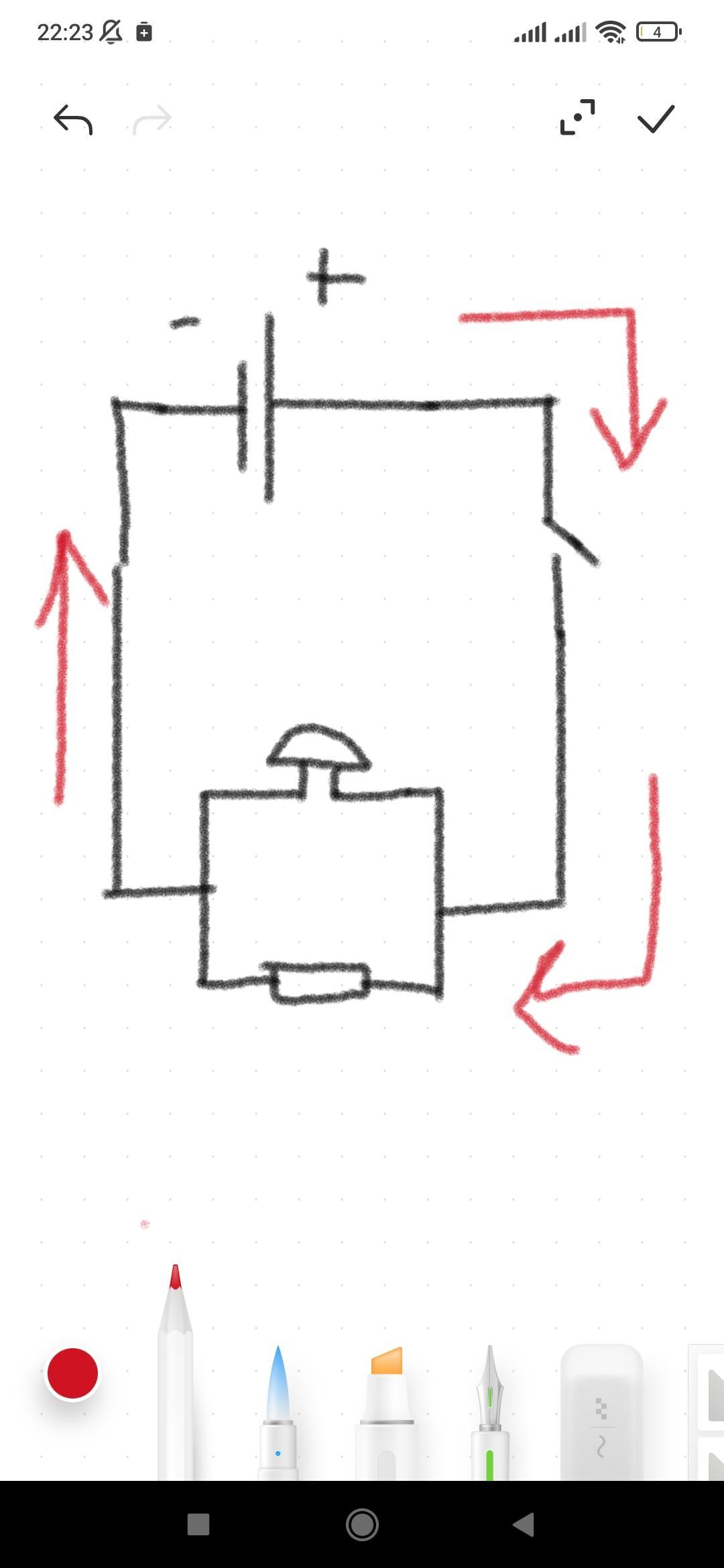 Накресліть схему електричного кола, яке складається з гальванічного елемента, ключа і паралельно з'єднаних електричного дзвінка та резистора. Стрілками позначте напрям струму у колі