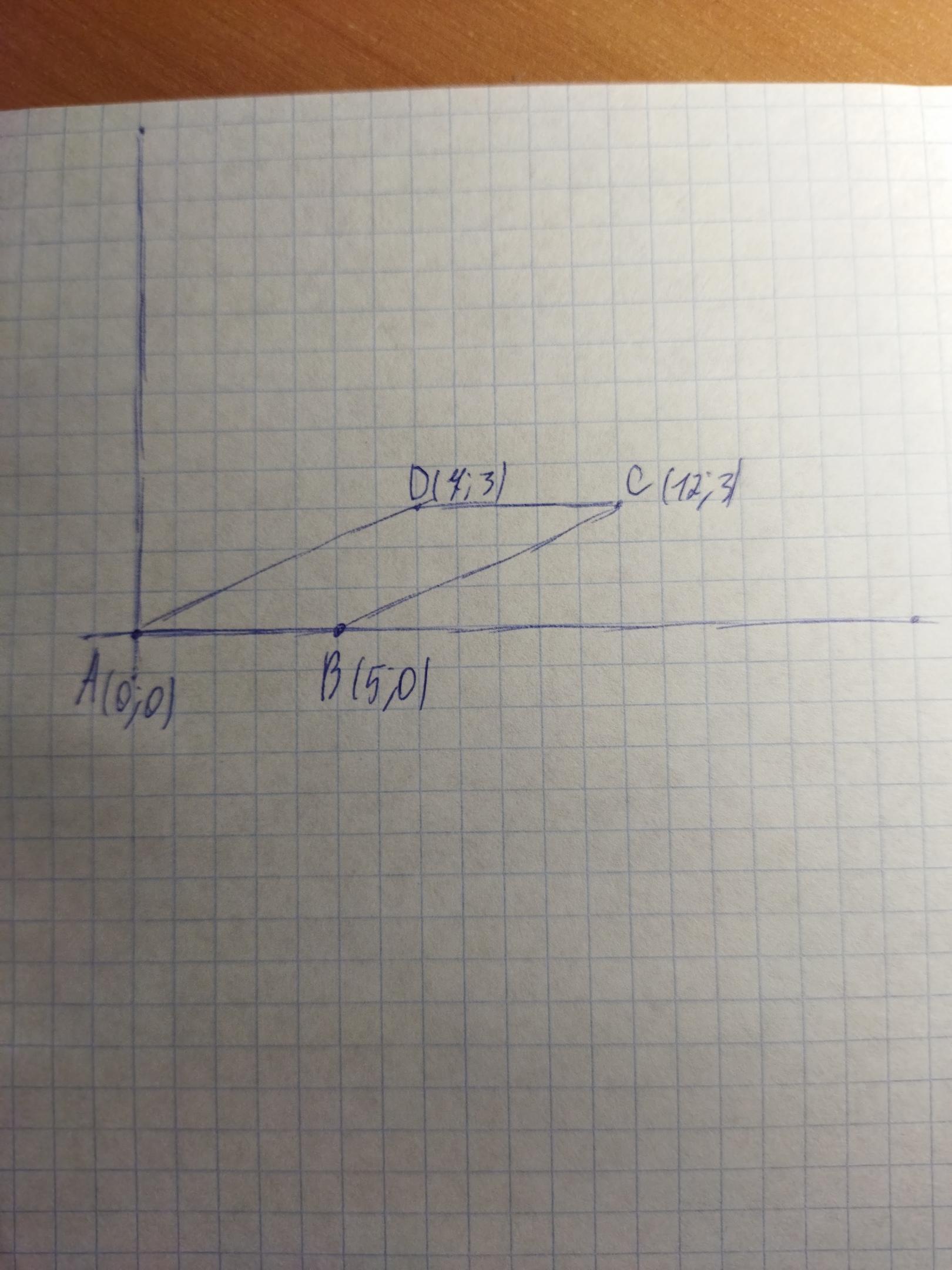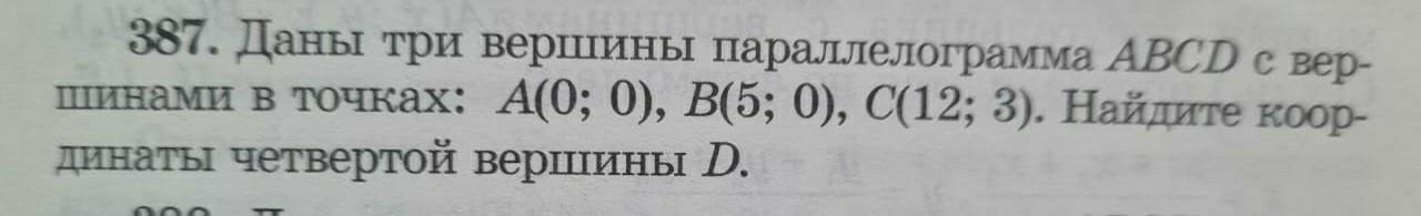 387. Даны три вершины параллелограмма ABCD с вершинами в точках: А(0; 0), B(5; 0), C(12; 3). Найдите координаты четвертой вершины D.