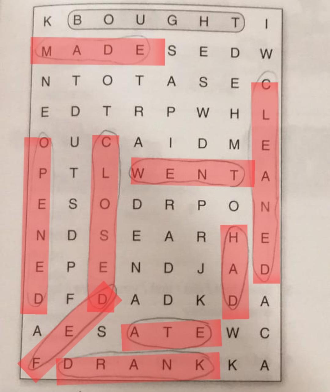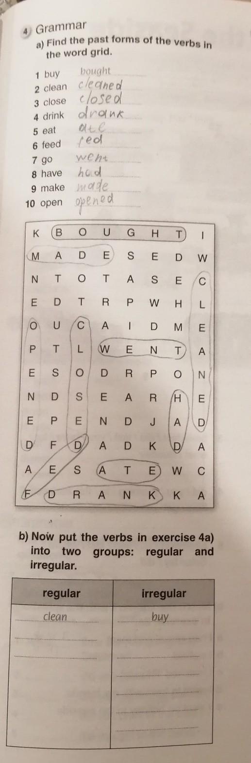 4 Grammar a) Find the past forms of the verbs in the word grid. 1 buy bought 2 clean cleaned 3 close closed 4 drink droing 5 eat alte 6 feed red went 8 have hod 9 make made 7 go 10 open opened к B OUGH T 1 M AD E S E D w Ν Τ o O T AS E E D T RP W H L п го о U CALD ME РТ L L w E N T A ES O DR PO N ND S E AR (Н I E E P E NDJ A D DF D A DK D А A E S A TE WC F D RANK КА b) Now put the verbs in exercise 4a) into two groups: regular and irregular. regular irregular clean buy