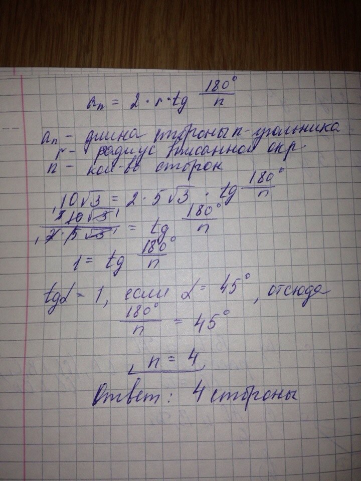 Правильный многоугольник со стороной 10 под корнем 3 см описан вокруг окружности найдите число сторон многоугольника.если длина радиуса окружности равна 5 под корнем 3 см