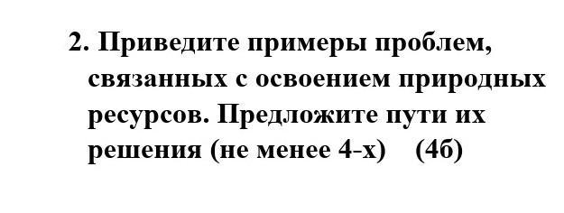 2. Приведите примеры проблем, связанных с освоением природных ресурсов. Предложите пути их решения (не менее 4-x) (46)