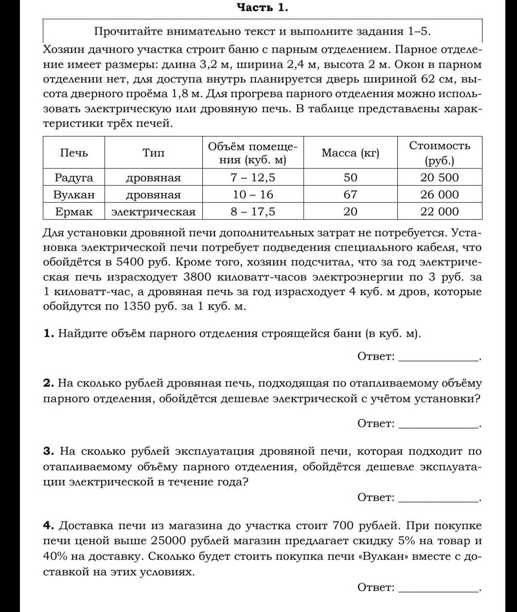 Часть 1. Прочитайте внимательно текст и выполните задания 1-5. Хозяин дачного участка строит баню с парным отделением. Парное отделе- ние имеет размеры: длина 3,2 м, ширина 2,4 м, высота 2 м. Окон в парном отделении нет, для доступа внутрь планируется дверь шириной 62 см, вы- сота дверного проёма 1,8 м. Для прогрева парного отделения можно исполь- зовать электрическую или дровяную печь. В таблице представлены харак- теристики трёх печей. Объём помеще- Стоимость Печь Тип Масса (кг) ния (куб. м) (руб.) Радуга дровяная 7 - 12,5 50 20 500 Вулкан дровяная 10 - 16 67 26 000 Ермак электрическая 8 - 17,5 20 22 000 Для установки дровяной печи дополнительных затрат не потребуется. Уста- новка электрической печи потребует подведения специального кабеля, что обойдётся в 5400 руб. Кроме того, хозяин подсчитал, что за год электриче- ская печь израсходует 3800 киловатт-часов электроэнергии по 3 руб. за 1 киловатт-час, а дровяная печь за год израсходует 4 куб. м дров, которые обойдутся по 1350 руб. за 1 куб. м. 1. Найдите объём парного отделения строящейся бани (в куб. м). Ответ: 2. На сколько рублей дровяная печь, подходящая по отапливаемому объёму парного отделения, обойдётся дешевле электрической с учётом установки? Ответ: 3. На сколько рублей эксплуатация дровяной печи, которая подходит по отапливаемому объёму парного отделения, обойдётся дешевле эксплуата- ции электрической в течение года? Ответ: 4. Доставка печи из магазина до участка стоит 700 рублей. При покупке печи ценой выше 25000 рублей магазин предлагает скидку 5% на товар и 40% на доставку. Сколько будет стоить покупка печи «Вулкан» вместе с до- ставкой на этих условиях. Ответ: