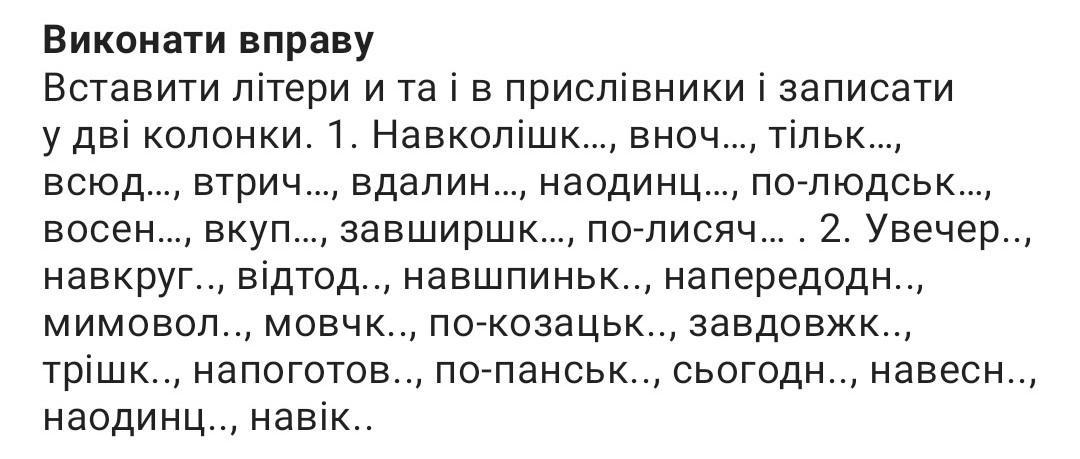 колона и : тільки, всюди , восени , завширшки, навкруги , навшпиньки, мовчки , завдовжки, трішки, навіки .