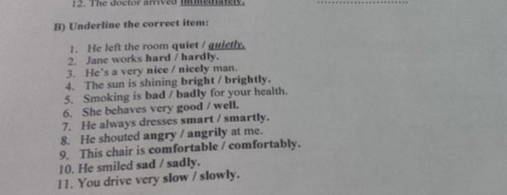 F B) Underline the correct item: 1. He left the room quiet / quietly 2. Jane works hard / hardly. 3. He's a very nice / nicely man. 4. The sun is shining bright/brightly. 5. Smoking is bad / badly for your health 6. She behaves very good / well. 7. He always dresses smart/smartly. 8. He shouted angry / angrily at me. 9. This chair is comfortable / comfortably. 10. He smiled sad /sadly. 11. You drive very slow / slowly. T R TO ey tonces