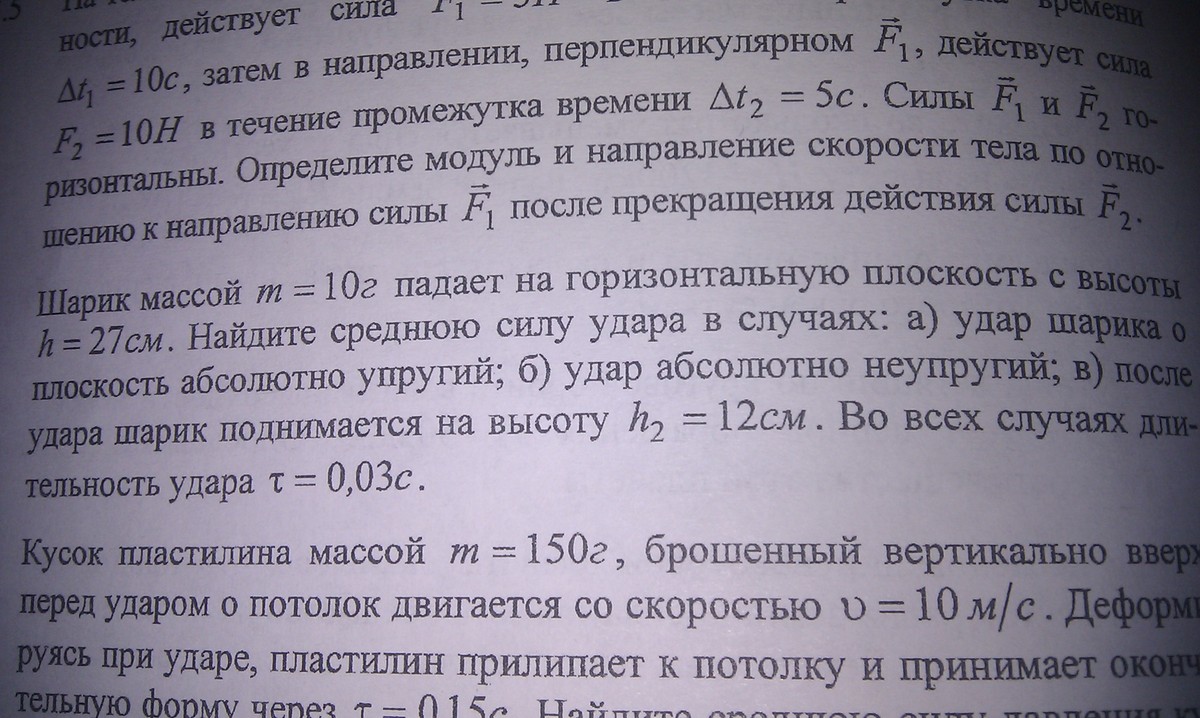 F1=(p1-p0)/tau = -2m*корень(2gh)/tau = -2*0,010*корень(2*10*0,27)/0,03 Н = -1,54919 H ~ -1,55 H