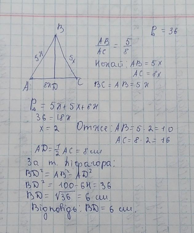 Бічна сторона рівнобедреного трикутника відноситься до основи як 5:6. Периметр трикутника дорівнює 48см. Знайдіть висоту трикутника проведену до основи