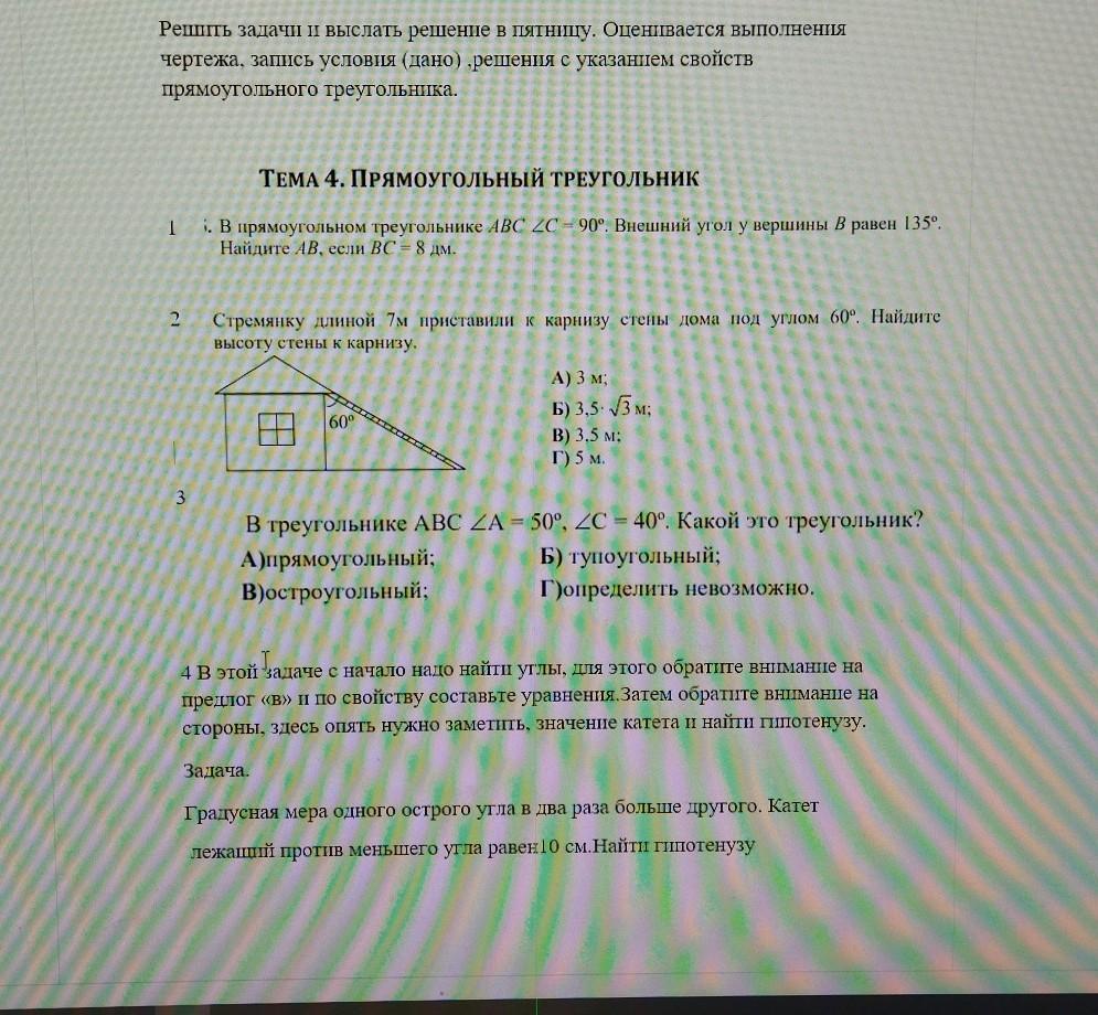 1)/_ А = 180 - 90 - /_В = 180 - 90 - (180 - 135) = 45°, |=>> АС = ВС = 8 дм