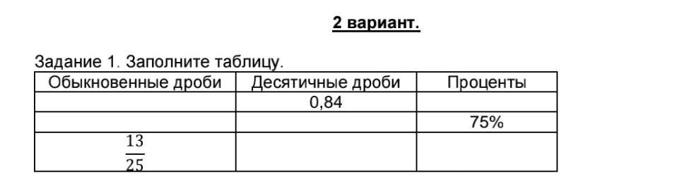Задание 1. Заполните таблицу. Обыкновенные дроби Десятичные дроби 0,84 Проценты 75% 13 25