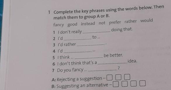 5 1 Complete the key phrases using the words below. Then match them to group A or B. fancy good instead not prefer rather would 1 I don't really doing that 2 I'd to... 3 I'd rather 4 I'd 5 I think .... be better. 6 I don't think that's a idea. 7 Do you fancy... A: Rejecting a suggestion-OOO B: Suggesting an alternative-Oon