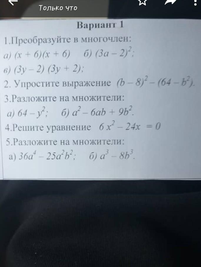 1)36 {a}^{4}  - 25 {a}^{2}  {b}^{2}  =  {a}^{2} (36 {a}^{2}  - 25 {b}^{2} ) =  {a}^{2} (6a - 5b)(6a + 5b) \\ 2) {a}^{3}  - 8 {b}^{3}  = (a - 2b)( {a}^{2}  + ab +  4{b}^{2} )