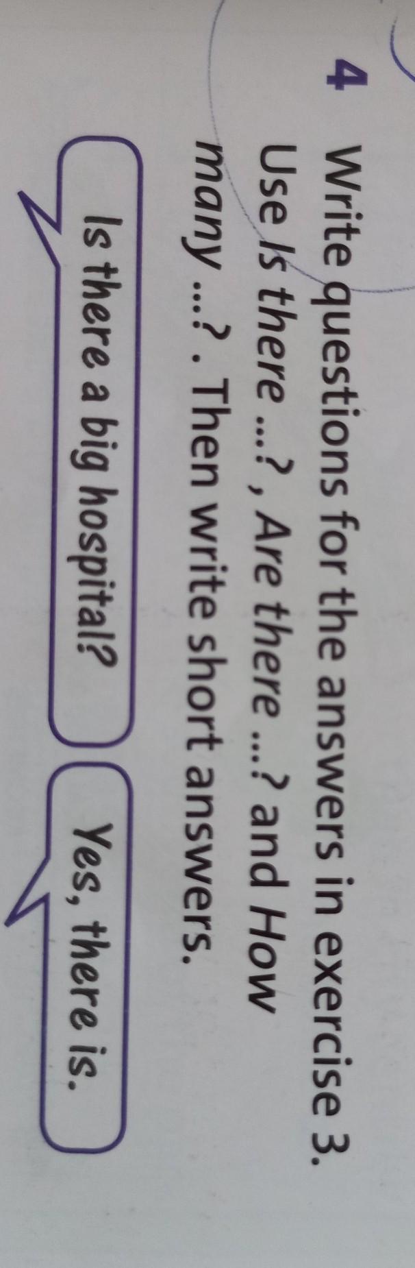 8 two cinemas 4 Write questions for the answers in exercise 3. Use Is there ...?, Are there ...? and How many ...?. Then write short answers, Is there a big hospital? Yes, there is.