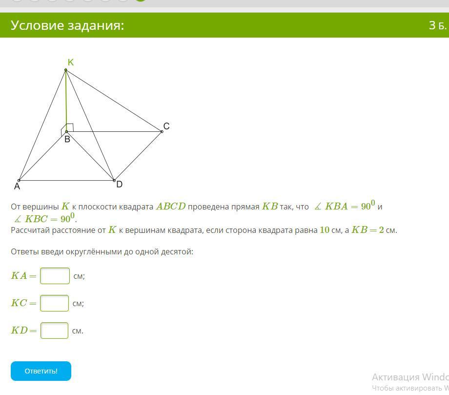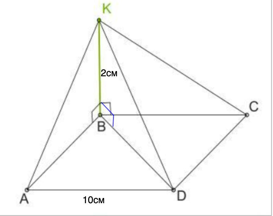 2) Расстояние от точки К до вершин квадрата А и С равно 10,2 см, до вершины D равно 14,3 см.