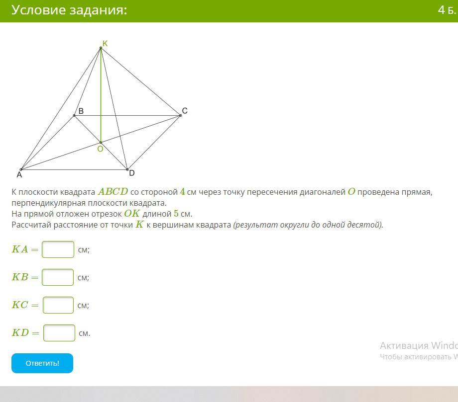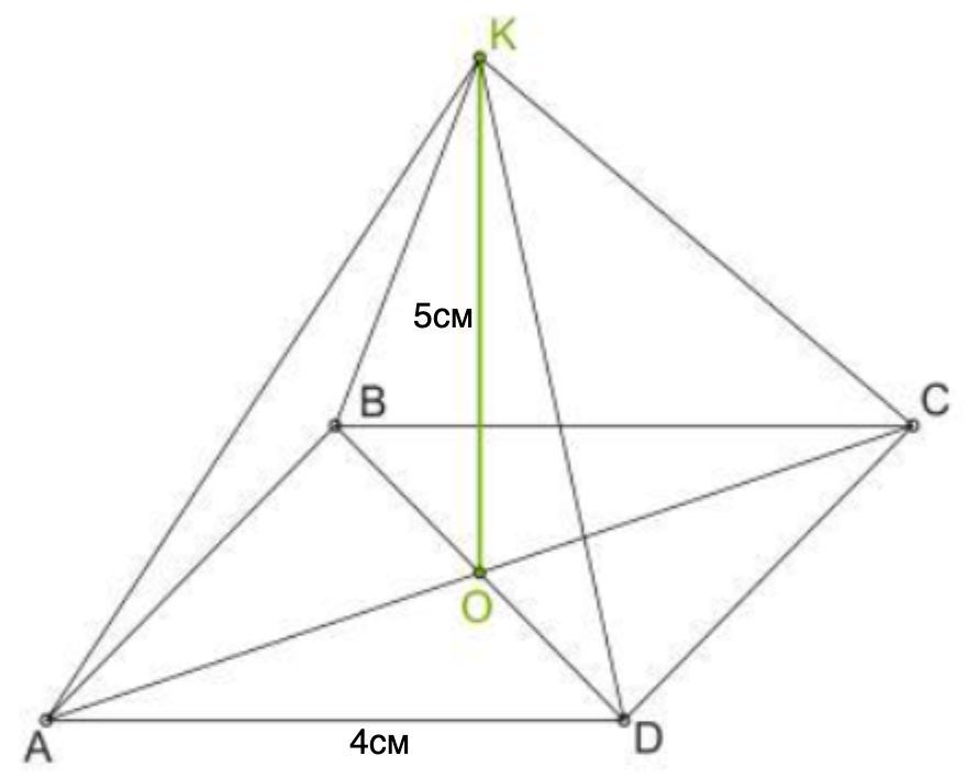 Расстояние от точки К до вершин квадрата равно 5,7 см.