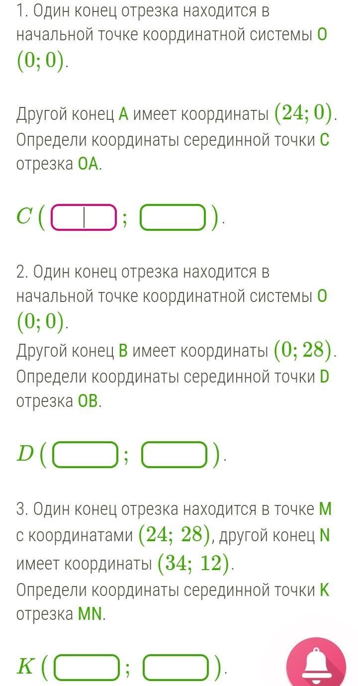 Определи координаты серединной точки C отрезка OA. 2. Один конец отрезка находится в начальной точке координатной системы O(0;0). Другой конец B имеет координаты (0;22). Определи координаты серединной точки D отрезка OB. 3. Один конец отрезка находится в точке M с координатами (12;22), другой конец N имеет координаты (14;26). Определи координаты серединной точки K отрезка MN.