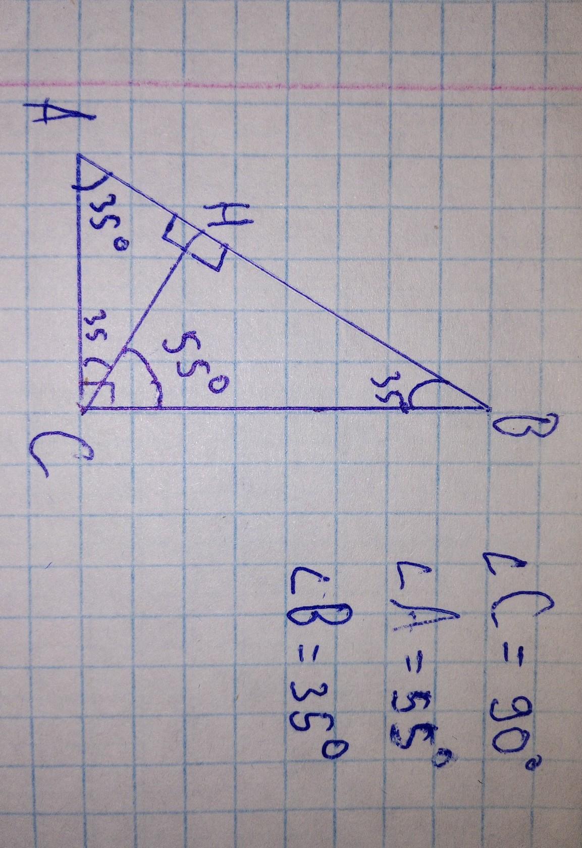 Для начала найдём третий угол, сумма всех углов равна 180 градусам, следовательно. 180-90-55=35 градусов. Высота даёт прямой угол, далее находим 3 стороны они также равны 35 градусам. Если не понятно, то на рисунке все углы видны