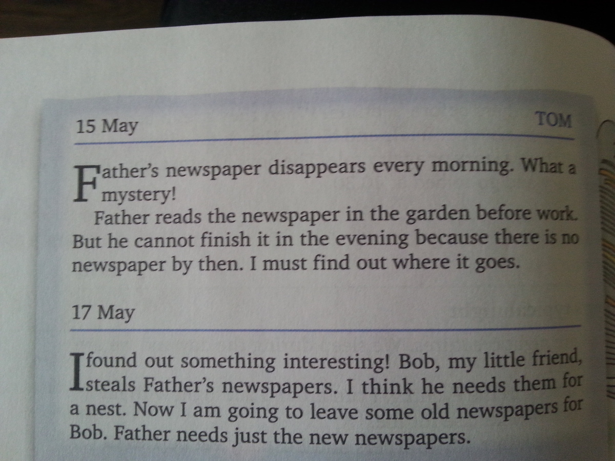 Я нашел что-то интересное. Боб, мой младший брат, крадет отцовскую газету. Я думаю она нужна ему для гнезда. Теперь оставляю старые газеты для Боба. Отцу нужны только новые газеты.