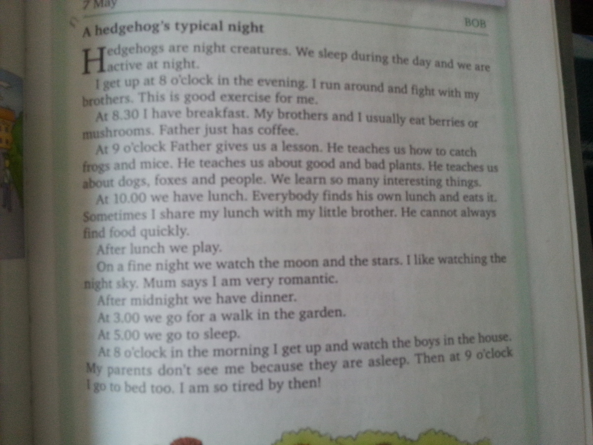 Я просыпаюсь в 8 веера. Я бегаю вокруг и дерусь с моими братьями. Это хорошее упражнение для меня.
